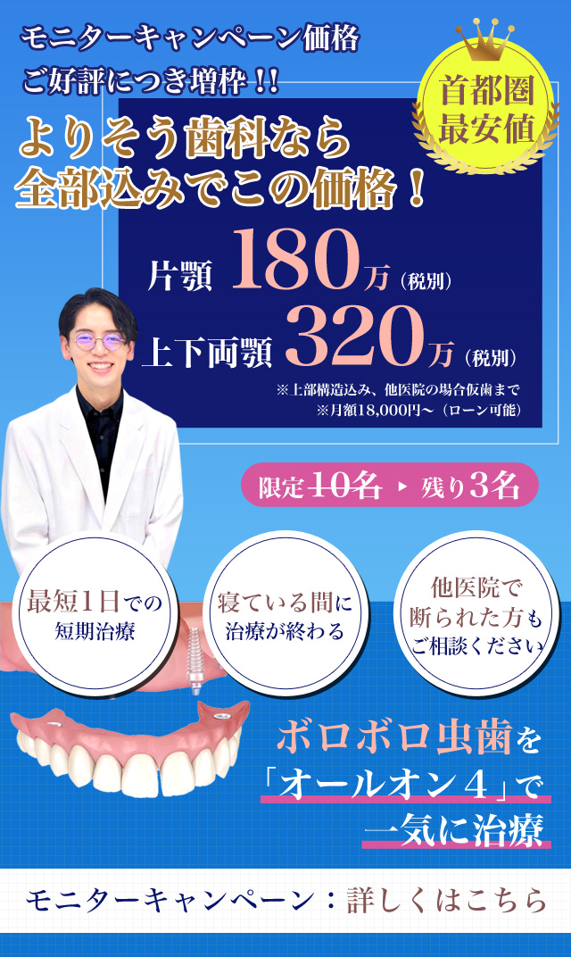 等のお悩みをお持ちの方はインプラント治療の場合、埋入本数も多くなり、